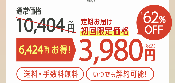 | 継続的に安く使いたい | 一番割引率の高い特典から始めたい | 初回が約62%OFFの特別価格であり、さらに定期便に縛りがないため、1回でやめる場合でも最もお得に本製品を試せます。 |