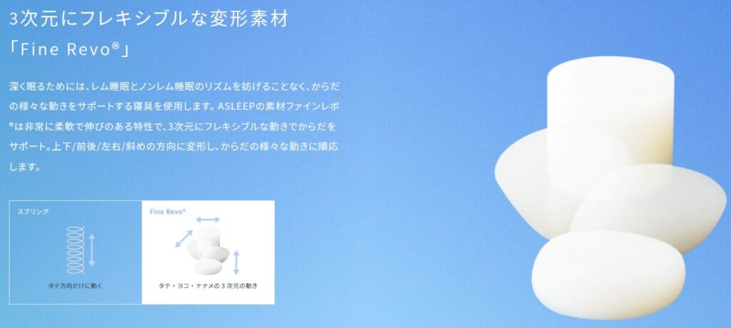 アスリープは、すべてのベッドマットレスに独自素材「ファインレボ(Fine Revo)」を採用しています。この素材が、質の高い眠りを支える大きな理由です。