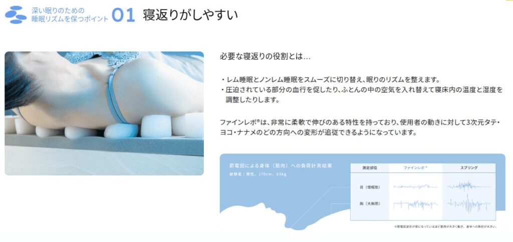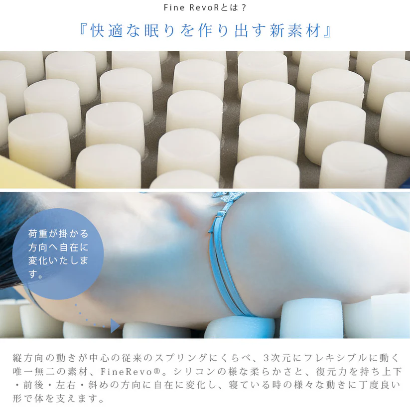 | 寝心地の感触 | 「柔らかすぎず、硬すぎないちょうどいい感触」「ふんわりと支えられ、体にぴったりフィットする」 | ファインレボのしなやかな弾力と3次元の動きが、体を「面」で支えます。水に浮いているような寝心地を作ります。 |
