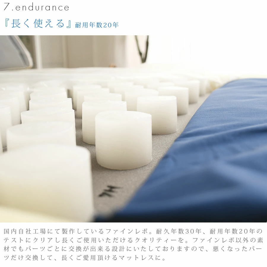| 長く使いたい | 何度もマットレスを買い替える費用を抑えたい、長く使えるものに投資したい。 | ファインレボ素材の高い丈夫さと、部品交換システムで長く使えるようになっています。 |