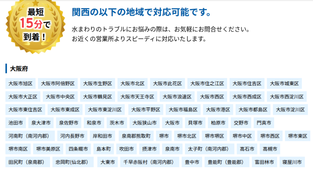 | 大阪府 | 【大阪市東部エリアを重点カバー】:大東市(赤井、曙町、泉町、岩田、大野、学園町、北条、御供田、三箇、新田、住道、大東町、津の辺、寺川、中垣内、南郷、錦町、西芦屋、野崎、灰塚、浜町、氷野、平野屋、深野、北新町、朋来、三住町、明美の里、諸福、龍間など全域)、東大阪市、門真市、四條畷市、交野市、守口市、枚方市、八尾市、池田市、泉大津市、泉佐野市、和泉市、大阪狭山市、貝塚市、茨木市、高槻市、河南町、河内長野市、岸和田市、泉南郡熊取町、堺市全区、泉南市、太子町、高石市、田尻町、忠岡町、千早赤阪村、豊中市、豊能町、富田林市、能勢町、羽曳野市、阪南市、藤井寺市、松原市、岬町:【大阪市全域】:旭区、阿倍野区、生野区、北区、此花区、住之江区、住吉区、城東区、大正区、中央区、鶴見区、天王寺区、浪速区、西区、西成区、西淀川区、東住吉区、東成区、東淀川区、平野区、福島区、港区、都島区、淀川区 |