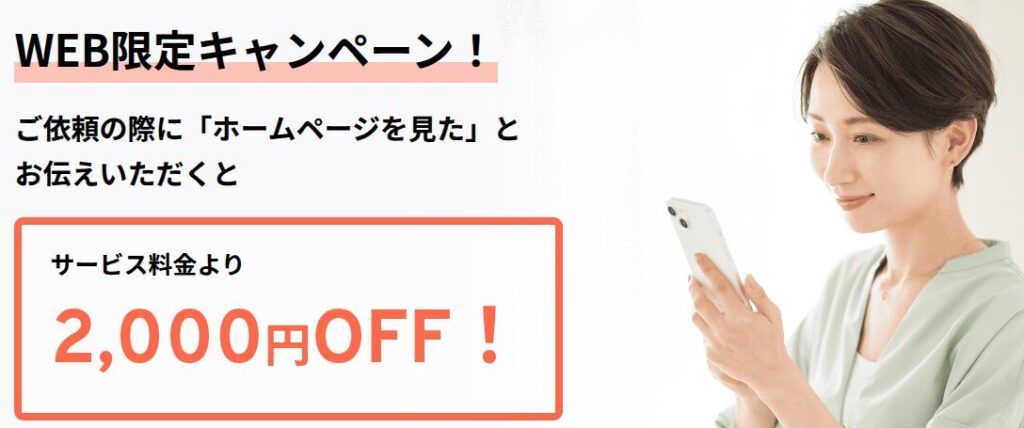 お願いする時に、公式サイトのお問い合わせフォーム(WEB申し込み)で「ホームページを見た」と伝えると、WEB限定割引として2,000円も安くなります。