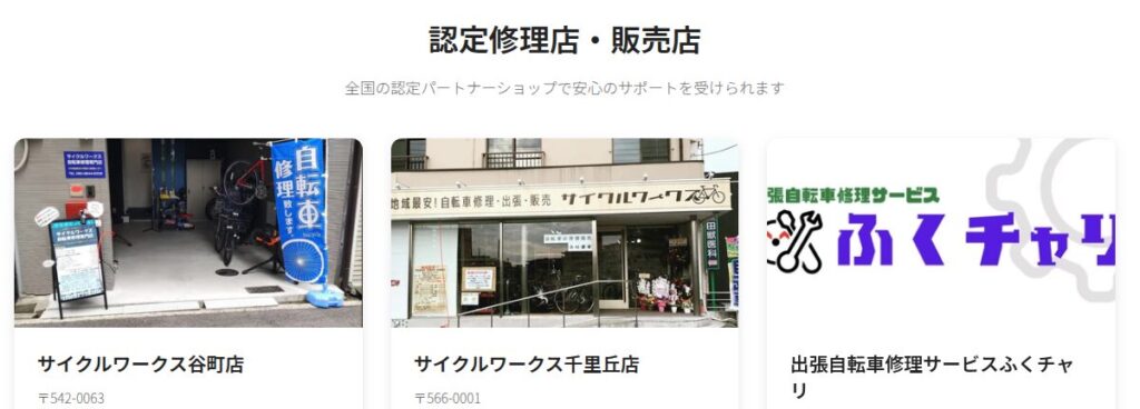 | サイクルワークス 千里丘店 | 大阪府 摂津市 千里丘1-11-10 | 近畿地方(要持込) |
