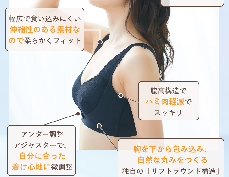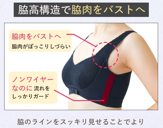 | 脇高設計 | 脇のハミ肉をしっかり抑える | バストの形が綺麗に見える |