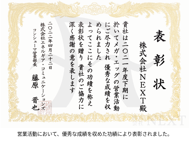 株式会社NEXTは、メガ・エッグだけでなくSoftBank光やauひかり等の大手通信キャリアからも「優良代理店」として何度も表彰されている、公式に認められた信頼できる代理店です。
