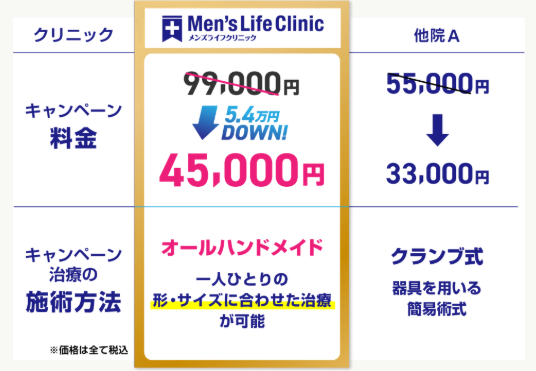 メンズライフクリニックの「スタンダードカット45,000円」というキャンペーン価格は、環状切開という一般的な術式を安価に受けられる。