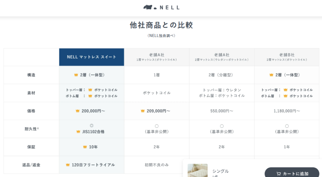 初期費用が高すぎる普通のNELLマットレスと比較して2倍以上の価格設定です。この価格は「消費」ではなく「日中の生産性向上への投資」と捉えてください。