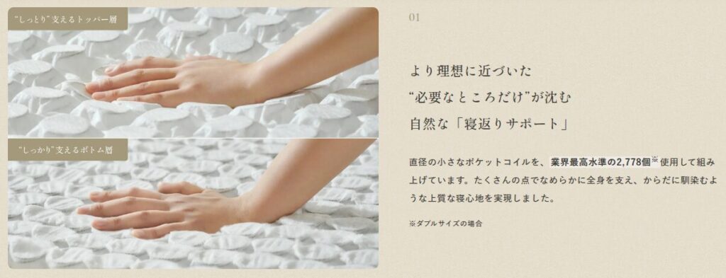 コイル密度が圧倒的に高いため、寝返りの際の体の動き出しや姿勢の微調整に対し、マットレスがより迅速かつ細かく追従します。