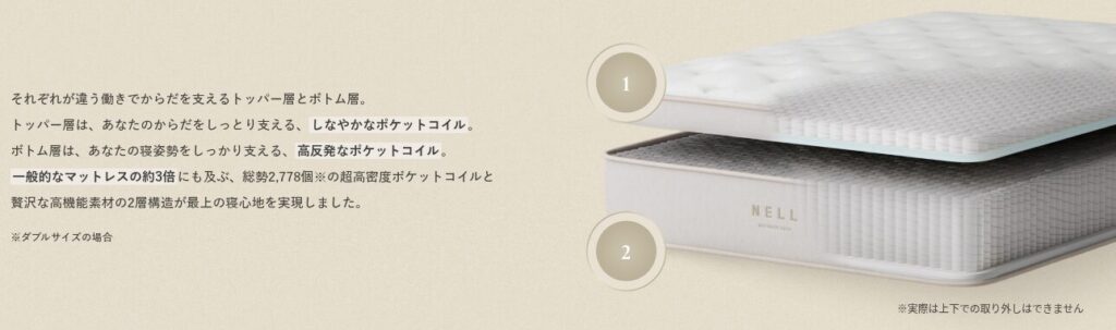 これにより、普通のNELLマットレスよりも強力かつ物理的に腰落ちを阻止する設計が施されています。