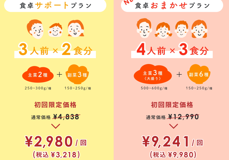 食卓サポートプラン(5品) | ¥4,838 | ¥3,218 | ¥990 | ¥3,218 | ¥2,610お得! | 約45%OFF |
