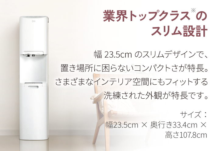- 「ウォーターサーバーって場所を取るイメージだったけど、幅23.5cmの細さで、キッチンの隅にスッキリ収まった。隙間にも置けて助かります。」