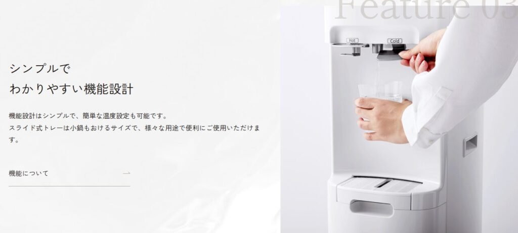 通常の温水に加え、再加熱機能により高温(約90℃)が出せるため、カップ麺や熱いお茶の「温度が足りない」という不満がありません。