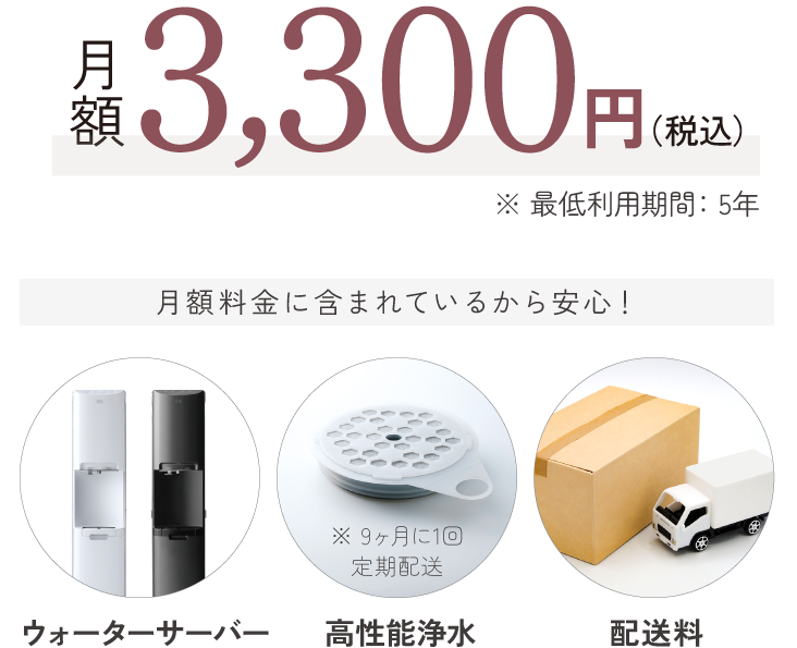 | 高性能浄水フィルター代 | 9ヶ月に1回、交換時期に合わせて自動的に配送されるフィルターの料金です。 |