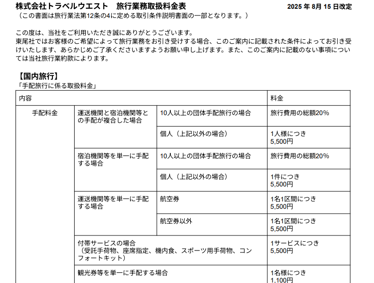 トラベルウエストの料金表にある「取扱料金」は、旅行業法に基づき定められた費用であり、以下の特別なサービスを提供するために必要です。